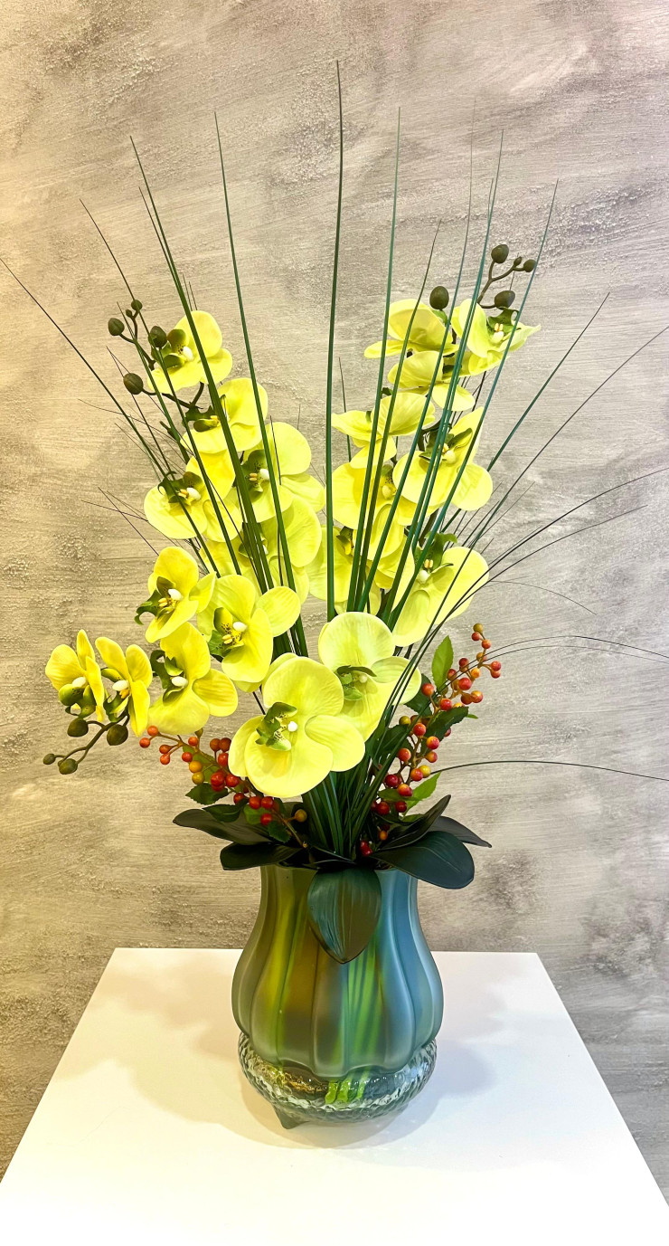 Mavi Cam Vazoda Sarı Orkide Aranjmanı