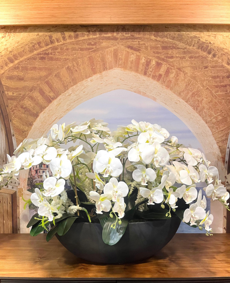 Siyah Beton Saksıda Beyaz Orkide Aranjmanı