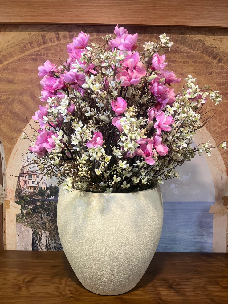 Beton Görünümlü Saksı Pembe Manolya ve Beyaz Nergis Aranjman
