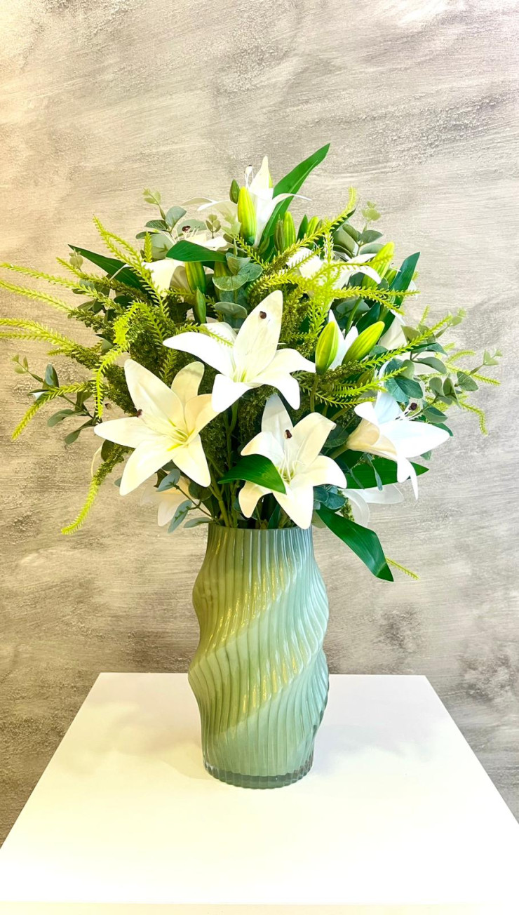 Yeşil Cam Vazoda Beyaz Zambak Ve Beyaz Sarkıt Aranjmanı
