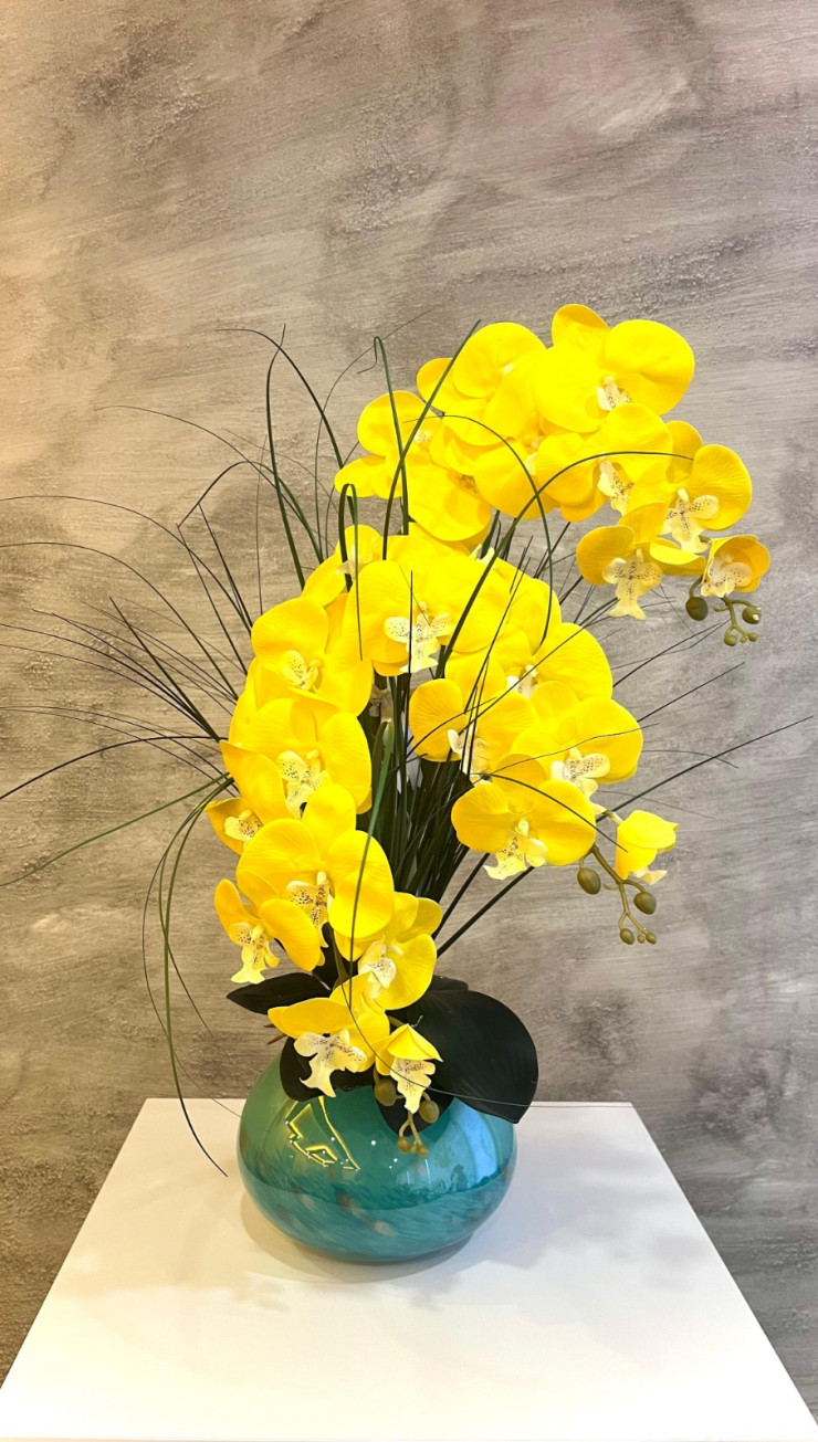 Mavi Cam Vazoda Sarı Orkide Aranjmanı