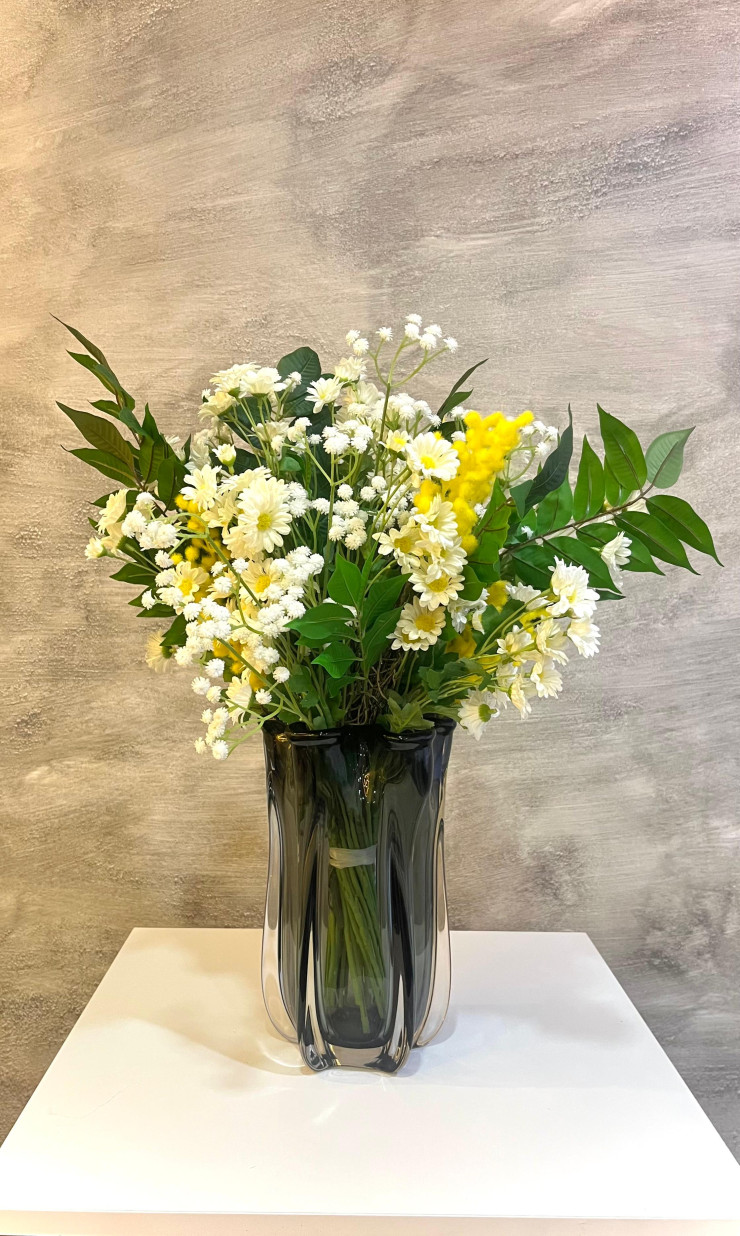 Siyah Cam Vazoda Papatya Ve Mimoza Aranjmanı