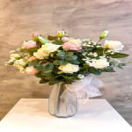 Cam Vazoda Pembe Beyaz Gül Ve Okaliptus Dalı Aranjmanı